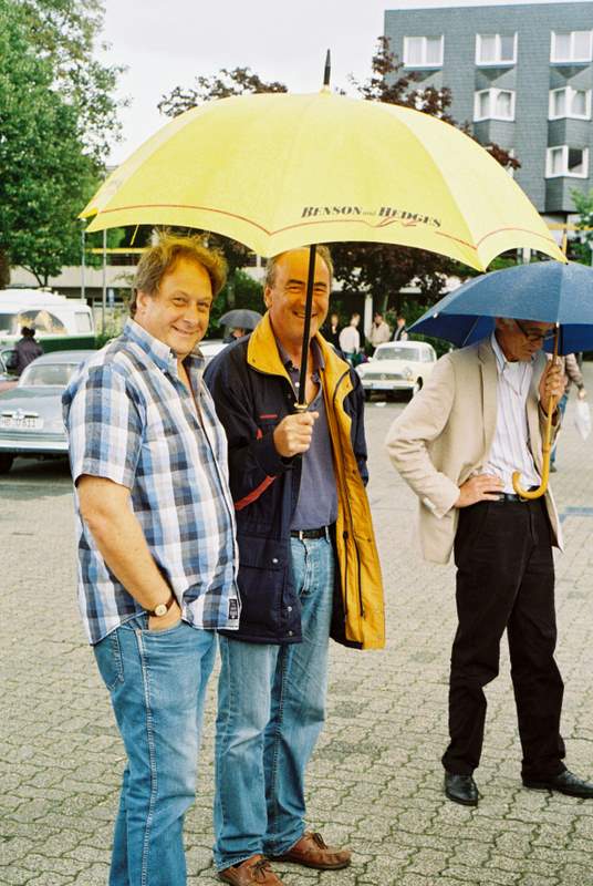 Patrick Mollard sheltering under Gavin Watson's umbrella during a short shower.