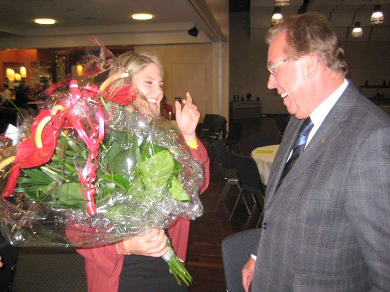 Cups and Flowers were awarded this is Kailly Woodroffe receiving flowers from Hartmut Loges having come to the meeting from Australia via England to drive one of Nick Driscoll's Borgwards to Korbach.